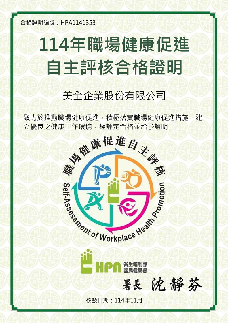 美全企業獲得職場健康促進自主評核合格證明